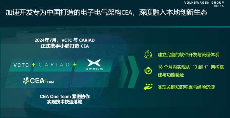 2024年7月,VCTC、CARIAD中国与小鹏汽车共同启动的CEA项目,合作打造大众汽车集团专为中国市场需求开发的新一代电子电气架构。