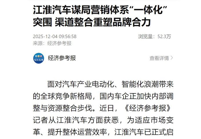 就在这样的竞争格局下,江淮汽车宣布整合乘用车、新能源、皮卡三大业务板块营销体系,构建统一的“江淮乘用车”品牌生态。而在不少业内人看来,这场整合绝非被动防御,而是江淮精准锚定行业痛点,以体系进化突破竞争壁垒的主动战略抉择。