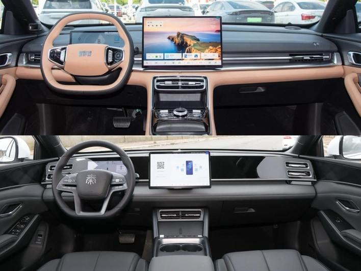 座舱内部,两者的仪表台和门板基本采用软性皮面覆盖,触感都不错。银河A7提供15.4英寸中控大屏和10.2英寸全液晶仪表屏,秦L采用12.8英寸中控屏和8.8英寸液晶仪表屏。银河A7的Flyme Auto车机系统除了有常规的车控与上网功能,拥有手车互联全家桶,手机打通更便利,还有多了智能壁纸、交互智能体、高德810导航等功能,在AI应用上更出色些,而秦L的车机在可玩性上略逊一些。