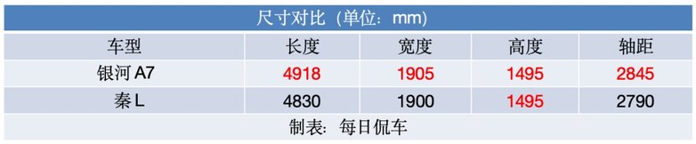 两车的尺寸都比较大,如果严格按照2800mm轴距作为中级车与紧凑级车的分界线,银河A7达到中级车水平,而秦L只能算偏大的紧凑级车,具体的车身尺寸对比表格见下图。外饰方面,秦L采用传统的大嘴格栅前脸和分体式头灯,看起来大气威武,但也多了些传统的“油腻感”。银河A7采用电车风格的封闭前脸,有贯穿式灯带,显得更时尚年轻,夜间的辨识度也更高。