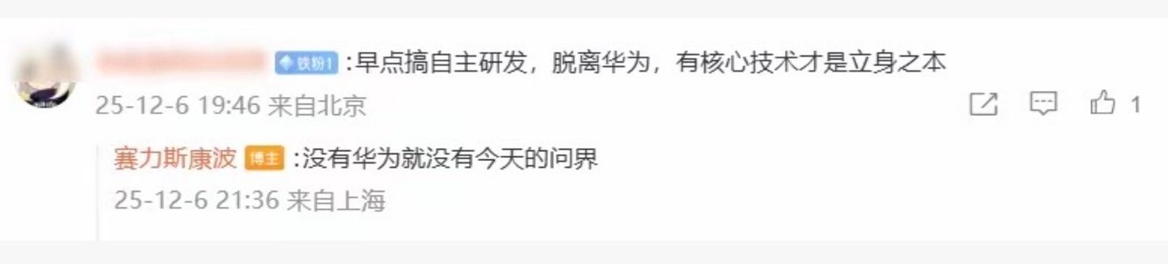 一位网友在赛力斯集团副总裁康波的社交媒体评论区留言,建议赛力斯“早点搞自主研发,脱离华为”,这条看似为企业长远着想的建议,却得到了一个斩钉截铁的回应。