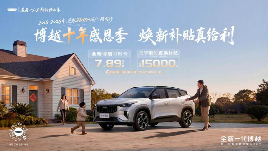 为感恩用户一路陪伴,全新博越正式开启“博越10年感恩季,焕新补贴真给利”限时购车补贴福利活动。据悉,厂家本次共拿出2亿元来补贴用户:2025年12月10日至2026年1月15日活动期间,购买全新博越限时享至高15000元厂家换购补贴,并且可与国家补贴及地方补贴叠加。此外,还可享7000元限时现金补贴、2年5万0息贷款、3年免费流量以及价值至高6000元免费配置等五大专属权益。全新博越以真金白银的补贴让利,让用户以A0 级SUV的价格,即可购得A级SUV,成就十万以内SUV性价比之王,让更多中国家庭能够开启高品质出行新方式。
