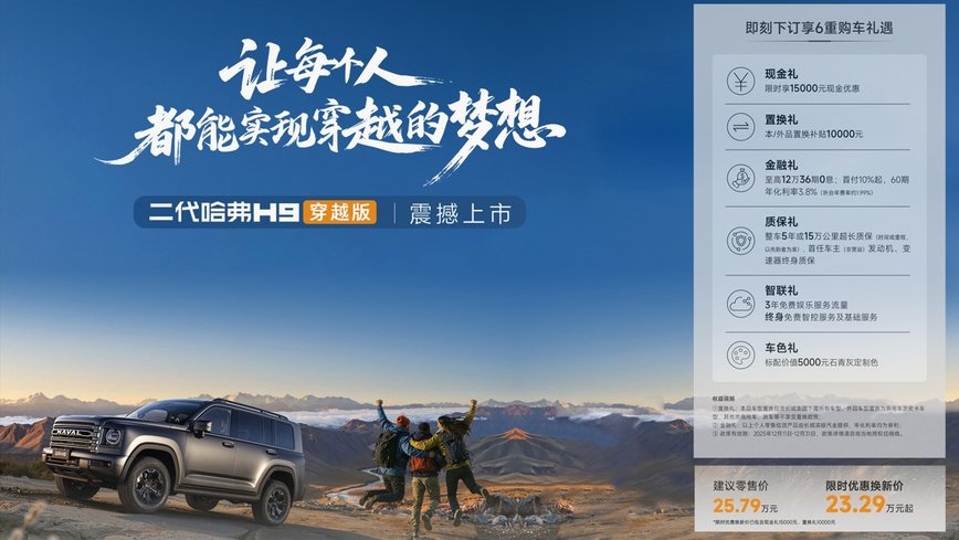 这台为远方持续进化的硬派越野——二代哈弗 H9 穿越版,建议零售价25.79万元,限时优惠换新价23.29万元起(含15000元限时现金礼+10000元置换补贴),上市同步带来六重购车礼遇。