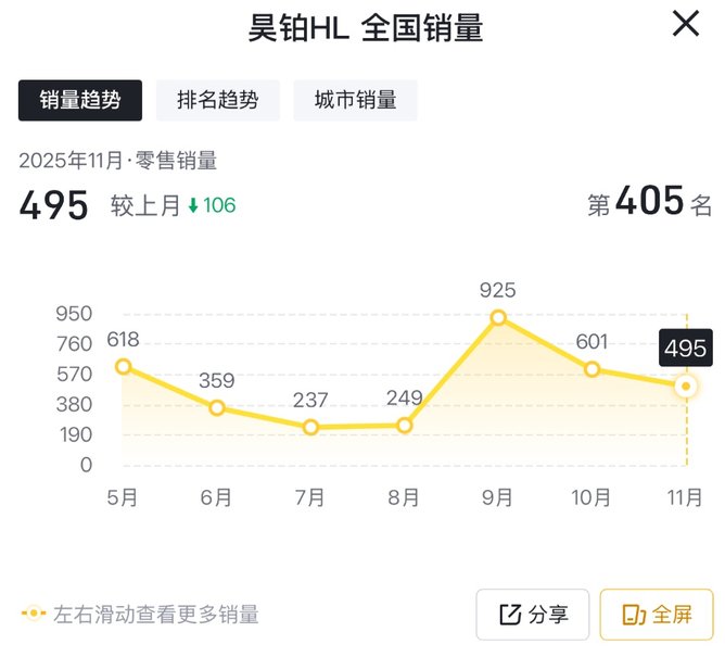 根据最新行业综合销量数据,广汽集团旗下高端新能源品牌昊铂的旗舰SUV车型HL在2025年11月的单月零售销量为495台。这一数字较上月下滑了17.63%。事实上,10月份,其销量同样环比下滑。