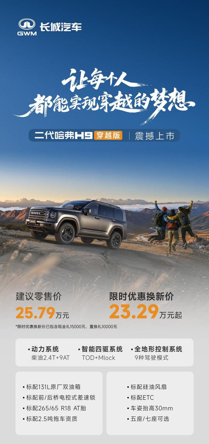 25.79万元的建议零售价,配合限时优惠换新价23.29万元起,二代哈弗H9穿越版以豪华越野车三分之一的价格,提供了媲美奔驰G级、路虎卫士的核心性能。