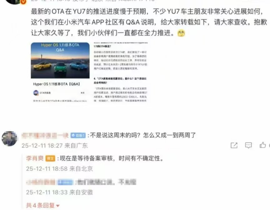 12月11日,小米汽车副总裁李肖爽在社交媒体转发官方Q&A说明,正式回应部分YU7车主尚未收到Xiaomi HyperOS 1.11 OTA推送的情况。