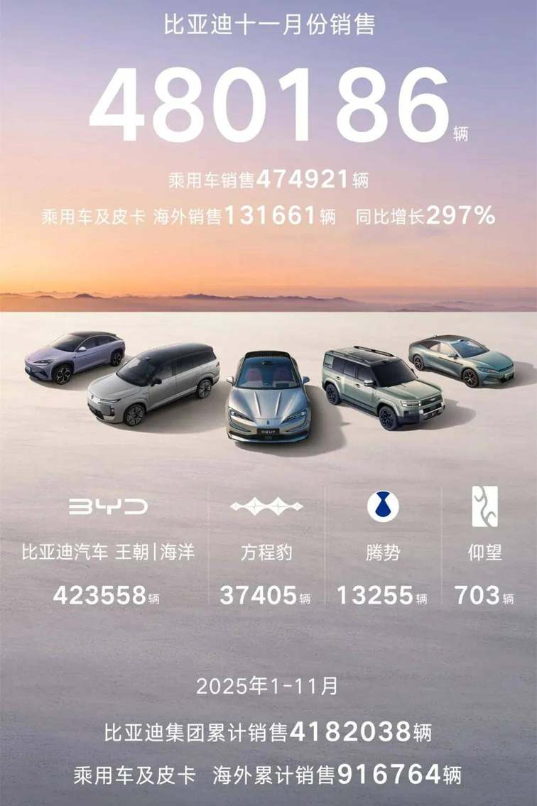 11月比亚迪新能源销售48万辆,虽然依旧“断层第一”,但销量同比下降5.3%;新能源乘用车销售47.5万辆,同比下降5.8%。剔除海外销量之后,上个月比亚迪国内销量为34.3万辆,已经连续7个月出现同比下滑。