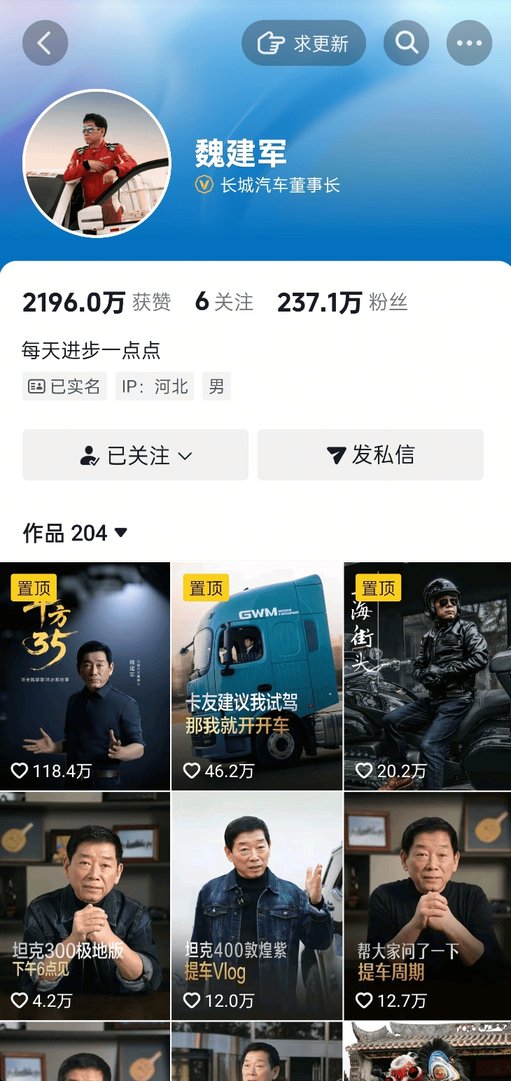 品牌认知度的焕新,是魏建军IP战略最直观的成果。此前“技术长城”的标签始终难以触达年轻群体,甚至在2023年举报比亚迪事件中陷入舆论被动。魏建军的亲自下场,彻底扭转了这一局面。他开通全平台社交账号,从实测全场景NOA的技术直播,到把股东大会搬进直播间的透明沟通、车展现场手法娴熟的“咖啡师”、化身“美食博主”带大家探访成都街头的地道美食,再到以“AG·哎呦魏”ID组队打王者荣耀的跨界尝试……这些看似不相关的尝试,却精准地覆盖了不同圈层的用户。数据最有说服力:其微博粉丝从10万跃升至39万,抖音粉丝突破236万,单条视频互动量屡破10W+,远超行业平均水平。
