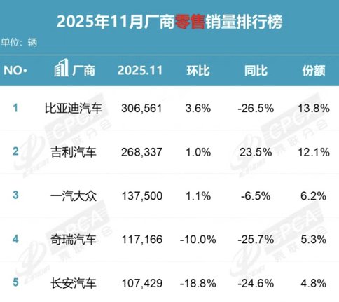 首先就是排第六的上汽通用五菱,零售销量是10.42万,同比增长4.9%,官方数据是16.6万辆,新能源零售量为9.61万辆,占比超过90%。然后是上汽大众,11月零售销量8.68万辆,同比下滑29%,11月官方销量是9万辆,是上汽集团第二大数据输出点。并且如果只算零售销量的数据,那五菱+上汽大众+智己+上汽自主+上汽通用别克等品牌的数据结合起来,也会超过26万,同样具备争夺12月零售销量冠军的能力。