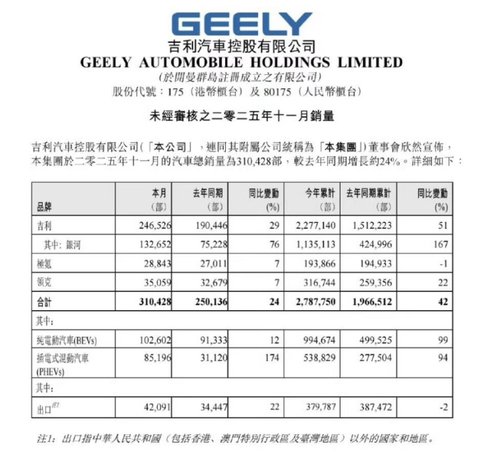 排名第二的是吉利,11月合计销量是26.83万辆,同比增长23.5%,市场份额达到12.1%,是TOP五中唯二破10%的。言归正传,和官方31.04万辆的数据相比少了4万多辆,差不多与官方4.2万辆的出口量相持平。此外,11月吉利新能源零售销量17.21万辆,占比超过60%;吉利银河品牌单月零售销量超12.3万,今年累计已经超百万。