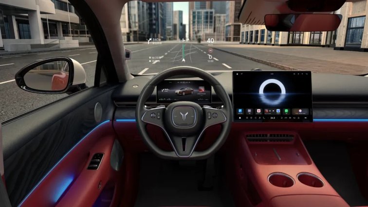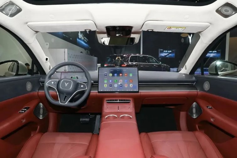 内饰方面,采用三辐式平底方向盘,并应用怀挡式换挡机构,副仪表台布局简洁,并未配备任何物理按键。中控中央搭载16.1英寸3K屏幕,内置鸿蒙智能座舱5.1系统,支持AI语音大模型和跨端交互,配备10.25英寸液晶仪表、AR-HUD抬头显示、50W手机无线充电面板和四温区空调。