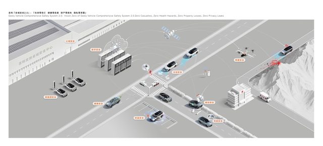 作为行业安全技术的先行者与引领者,吉利在“全域AI”技术体系的赋能下,以“AI为纲 责任为本”,基于原有的“全域安全”技术体系进阶打造“全域安全2.0”技术体系。结合智能时代的安全新需求和新挑战,“全域安全2.0”技术体系秉持“以人为尊”理念,通过技术升级、能力突破与范式创新,将侧重“整车安全”的视角升级为“人-车-路-云-星”的生态视角,旨在贯穿用户出行全场景、覆盖出行全领域、联动出行全生态;并以“生命零伤亡、健康零危害、财产零损失、隐私零泄露”四大安全愿景为指引,逐步构建的一套为消费者提供全面的安全保障技术体系。