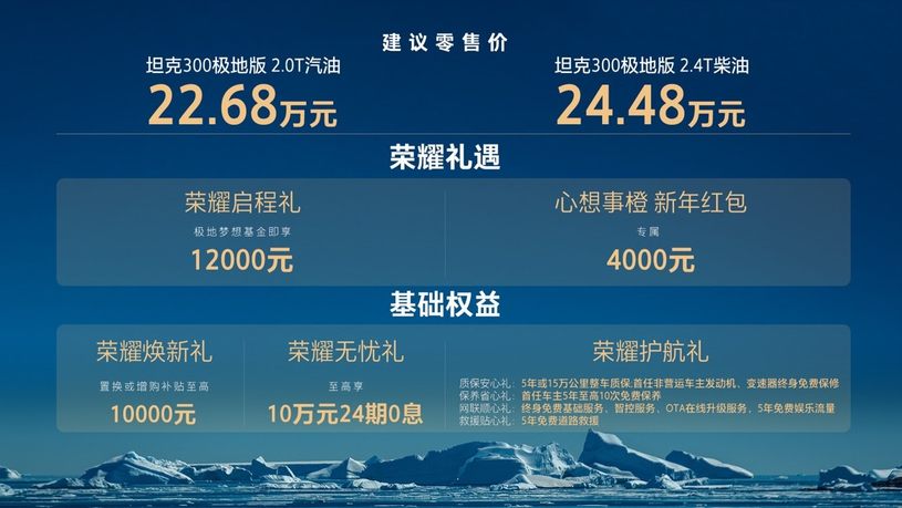 此次上市,坦克300极地版推出多重购车礼遇:12000元极地梦想基金、4000元“心想事橙”新年红包,以及5年或15万公里整车质保、首任非营运车主发动机与变速器终身免费保修、5年至高10次免费保养、终身免费基础网联服务等权益,进一步降低用车门槛。