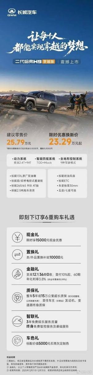 二代哈弗 H9 穿越版官方建议零售价 25.79 万元,限时优惠换新价 23.29 万元起,并同步带来 6 重购车礼遇,加速“越野平权”落地。