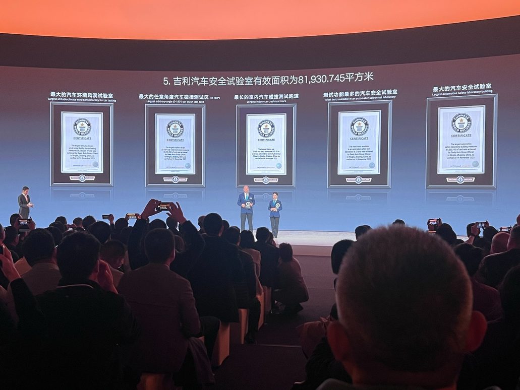 这座安全中心一口气拿下“全球最大的汽车安全试验室、全球最长的室内汽车碰撞测试跑道、全球最大的汽车环境风洞试验室”等5项吉尼斯世界纪录。同时,吉利发布全面进阶的“全域安全2.0”技术体系,并联合中汽中心、中国检验认证集团、清华大学等机构推出行业首个《智能汽车全域安全发展白皮书》。