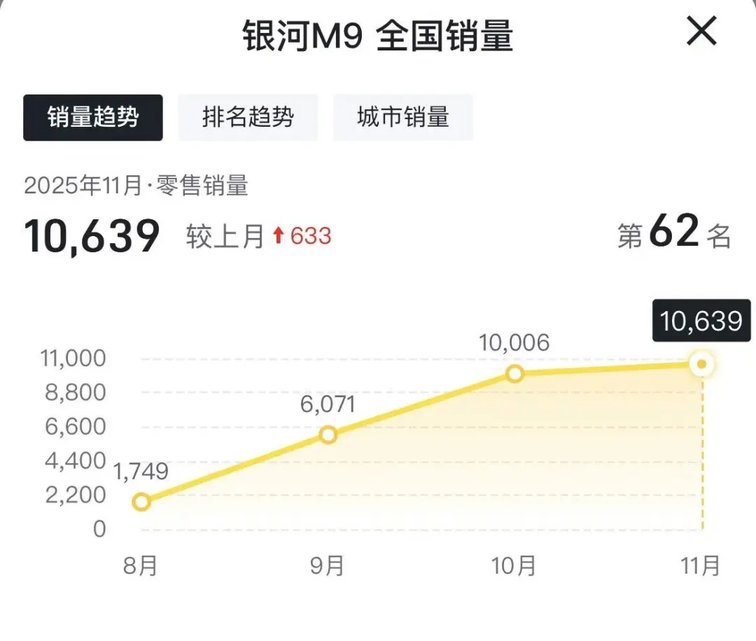 四款大六座SUV11 月销量呈现出显著分化态势,其中银河 M9 销量表现亮眼破万,乐道 L90 销量环比大幅下滑,奇瑞风云 T11 作为新车首月零售成绩一般,深蓝 S09 则销量惨淡濒临停产。