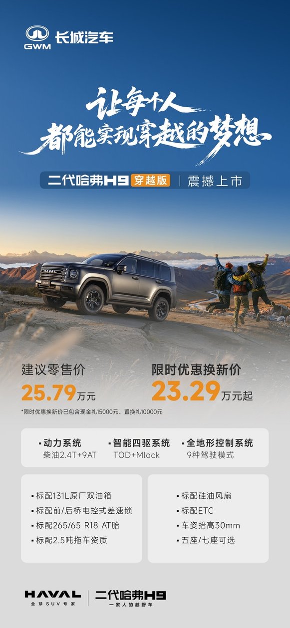 国产长穿天花板!二代哈弗H9穿越版售23.29万起!