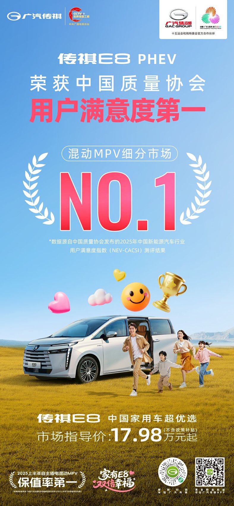 传祺E8获 2025 年 NEV-CACSI细分市场满意度第一,已经超越了单一产品维度的胜利,这更代表着自主品牌在高端新能源家用车领域,已具备定义市场标准的能力。它不仅是出行工具,更是承载家庭情感、拓展生活半径的“移动幸福空间”,而超九万家庭的满分认可,也正是“家有E8双倍幸福”的用户口碑印证,选择传祺E8,便是选择一份经过权威认证的满意,一种舒适、自由、安心的家庭生活新方式。