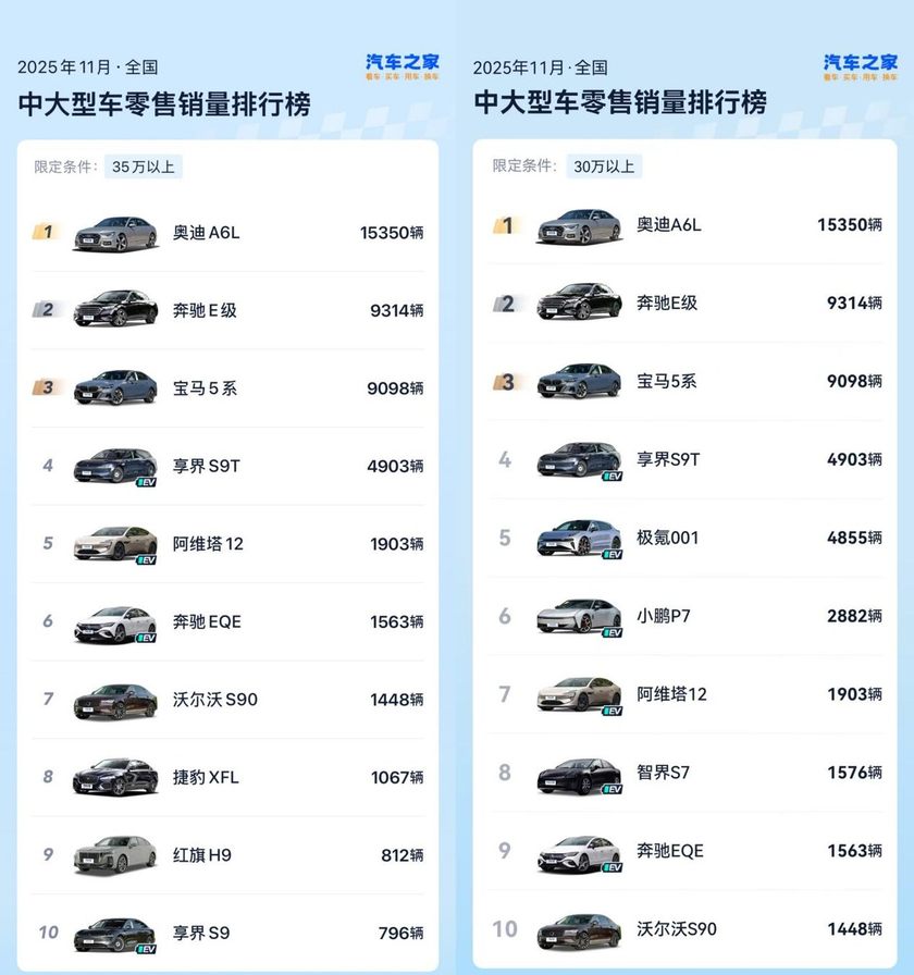 近日,11月汽车品牌销量公布,鸿蒙智行享界轿旅双子星享界S9T、享界S9持续发力,在中大型车豪华轿车零售销量排名中,享界品牌紧随BBA,跻身前四。