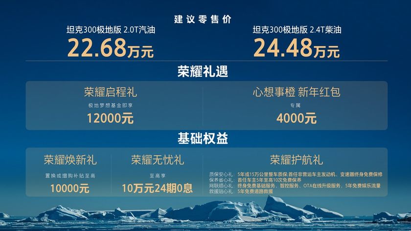 2025年12月11日,在坦克300全球用户达成50万之际,坦克300极地版正式上市。官方建议零售价,坦克300极地版2.0T汽油22.68万元,坦克300极地版2.4T柴油24.48万元,并推出荣耀启程礼、心想事橙新年红包和多项基础权益等多重购车礼遇。