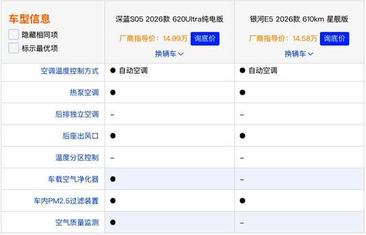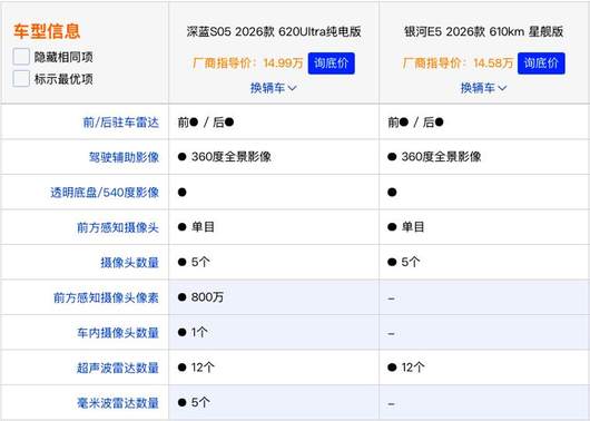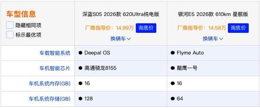 当下15万内纯电SUV市场竞争日趋激烈,消费者对车型的续航、空间、智能、安全等维度提出了更高要求。今天,角师傅带来两款车供您选择,第一台为深蓝S05620 Ultra纯电版,指导价为14.99万;另一款为吉利银河E5 610km星舰版,指导价为14.58万。两款车型各有特色,究竟哪款更契合你的用车需求?本文将从核心产品力维度展开客观对比,为你的购车决策提供专业参考。