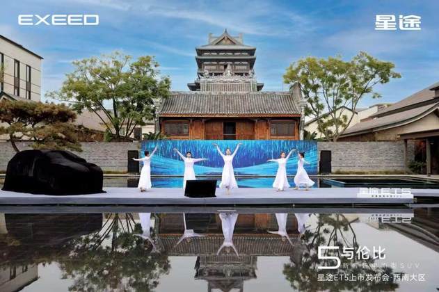 活动现场,东安阁酒店的新中式美学与星途ET5的设计理念相得益彰。酒店以院串线,流水、松柏、竹林构成的山水画卷与新车的凌厉线条相映成趣;吊脚飞檐的仿古戏台与通透回廊环绕的主会场,将东方气韵与现代科技氛围巧妙融合,嘉宾移步异景间,既能感受古典诗情,又能触摸未来出行的脉搏。