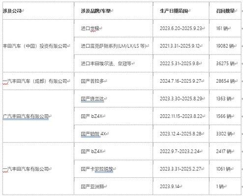 一汽丰田汽车(成都)有限公司主要召回国产普拉多车型;广汽丰田汽车有限公司则召回国产锋兰达、bZ4X和铂智4X等车型。