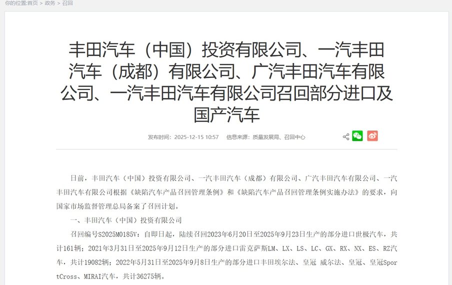 根据国家市场监督管理总局12月15日发布的公告,丰田汽车在华四家企业已经正式备案了召回计划。
