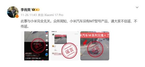 然而,在小米汽车努力应对安全问题和舆论挑战的同时,网络上又出现了不实谣言。近期,小米汽车副总裁李肖爽发文辟谣 " 小米汽车 M 系列又撞人了 " 相关事件。他明确表示,此事与小米完全无关,并且强调小米汽车目前并没有 M7 型号产品,呼吁广大网友不信谣、不传谣。