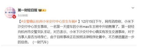 12 月 15 日,有媒体报道称,网传小米下沙交付中心发生事故,一名首日提车的小米汽车车主在交付中心将一名中升销售人员撞倒。对此,交警部门表示,小米下沙交付中心确实有发生交通事故,对于当事人是否当场身亡,由于目前事故正在按照法律程序处置中,不方便透露进一步的信息。