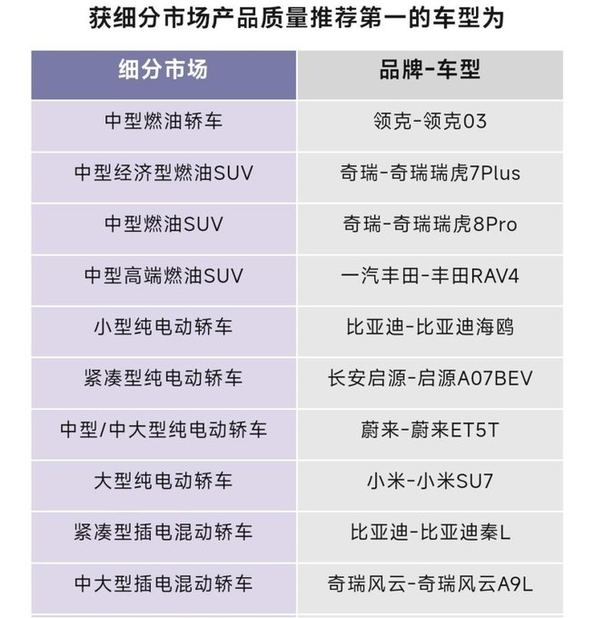 在产品质量推荐评选中,奇瑞瑞虎7Plus获评中型经济型燃油SUV第一,奇瑞瑞虎8Pro拿下中型燃油SUV第一,奇瑞风云A9L则摘得中大型插电混动轿车第一,三款车型分别在各自赛道凭借严苛的品控标准和出色的产品品质脱颖而出。
