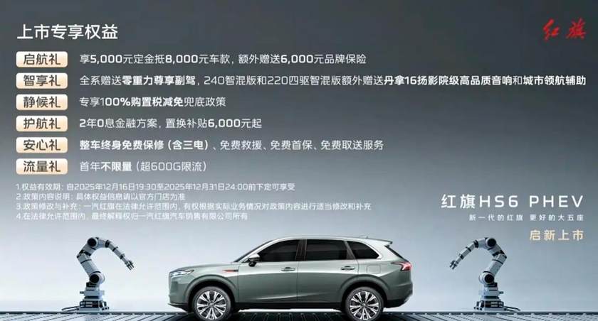 就在今天(12月16日),一汽红旗全新插混中大型SUV——红旗HS6 PHEV正式上市,共推出3款车型,售价区间为17.88-22.88万元,另外上市期间还提供六项上市权益。很显然,红旗已经开始走“亲民”路线,不再是那个让人觉得有距离感的“国车”形象。
