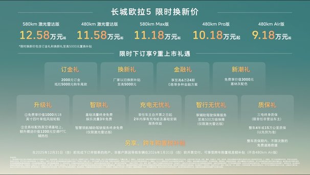 2025年12月16日,长城汽车欧拉品牌在其保定总部宣布,全新A级纯电SUV欧拉5正式上市。新车推出5款配置车型,官方指导价区间为9.98万至13.38万元。为提升市场竞争力,欧拉同步启动限时换新政策,起售价降至9.18万元,该权益包含“订金礼”和“换新礼”,其中以旧换新补贴最高5000元。