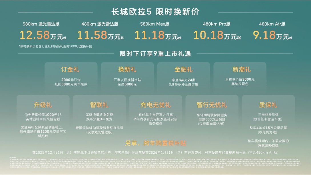 2025年12月16日,长城汽车欧拉品牌全新A级纯电SUV欧拉5正式上市 ,新车共推出5款配置,售价区间为 9.98万至13.38万元,限时换新价9.18万元起(限时换新价包含“订金礼”和“换新礼”至高5000元以旧换新补贴)。为回馈广大用户的热爱与支持,在2025年12月31日前下订并锁单还可以享受9重上市好礼。这款集极美设计、极智科技与全球品质于一身的车型,重新定义了A级纯电SUV的价值标准。