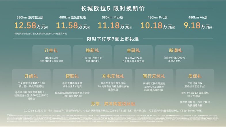 2025年12月16日,长城汽车欧拉品牌全新A级纯电SUV——长城欧拉5正式上市。新车共推出5款配置,建议零售价区间为 9.98万至13.38万元,限时换新价9.18万元起(限时换新价包含“订金礼”和“换新礼”至高5000元以旧换新补贴)。为回馈广大用户的热爱与支持,即日起至2025年12月31日,用户下订并锁单即可尊享包含订金礼、换新礼、智行无忧礼在内的9重上市好礼,以及跨年购置税补贴(不含480km Air版)等丰厚购车权益。凭借诚意十足的价格权益与越级产品力,长城欧拉5致力于成为全球年轻用户的“严选搭子”。