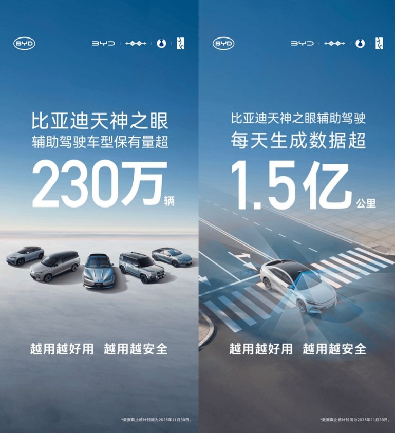 数据显示,截至2025年11月底,比亚迪搭载“天神之眼”驾驶辅助系统的车型累计销量已突破230万辆,持续蝉联中国辅助驾驶车型销量及系统装车量榜首。这标志着比亚迪推动的“全民智驾”战略已取得显著成效,智能驾驶正从高端配置加速向主流市场普及。