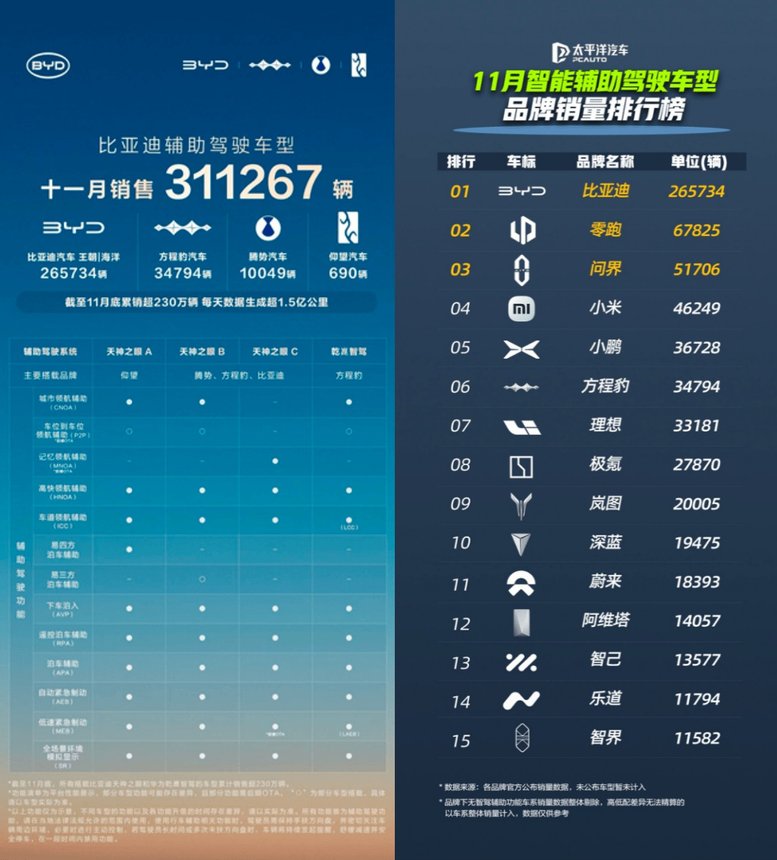 近日,比亚迪公布了其搭载天神之眼辅助驾驶系统的车型在11月的销售数据,全月销量达311267辆,继续引领市场。其中,比亚迪王朝与海洋系列贡献265734辆,方程豹、腾势、仰望等高端及个性化品牌亦表现稳健,共同构筑了比亚迪在智能驾驶领域的强大产品矩阵。