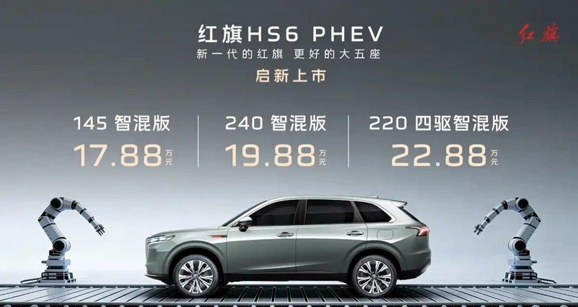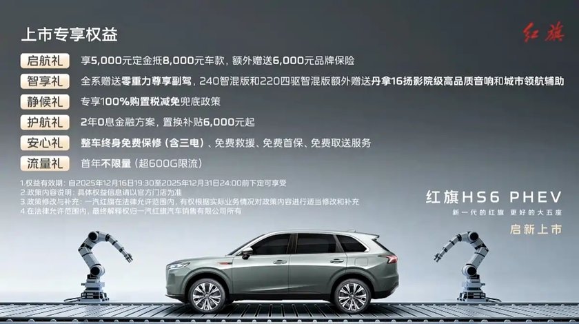 12月16日,红旗HS6 PHEV正式上市,新车共推出3款车型,售价区间为17.88-22.88万元。据悉,新车定位插混中大型SUV,并且也是红旗“鸿鹄”混动平台的全新车型。另外关于新车的权益,大家可以看下图。至于新车到底如何,我们接着看下去。