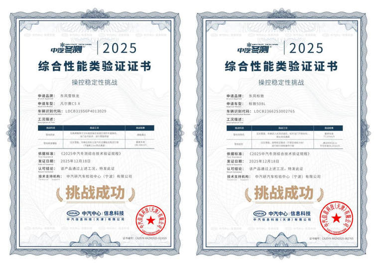 12月18日,在中国汽车技术研究中心主办的“2025极寒驾控安全主题技术验证”中,东风雪铁龙凡尔赛C5 X与东风标致508L凭借卓越的操控稳定性,双双斩获“操控稳定性挑战”验证证书。其中,凡尔赛C5 X在雪地爬坡与雪地高速爆胎测试中表现稳健,东风标致508L则在雪地双移线与雪地蛇形测试中展现出精准的操控功底。这一成绩,充分印证了两款车型扎实的整车品质与法系品牌在极端环境下的安全技术底蕴。