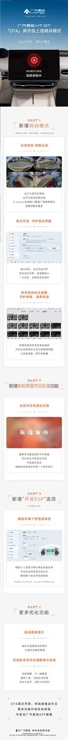 12月16日,广汽昊铂HT/GT车型正式启动了新一轮OTA推送。本次升级聚焦于提升车辆在静态场景下的安全防护与个性化用车体验,其中重点新增了“哨兵模式”。