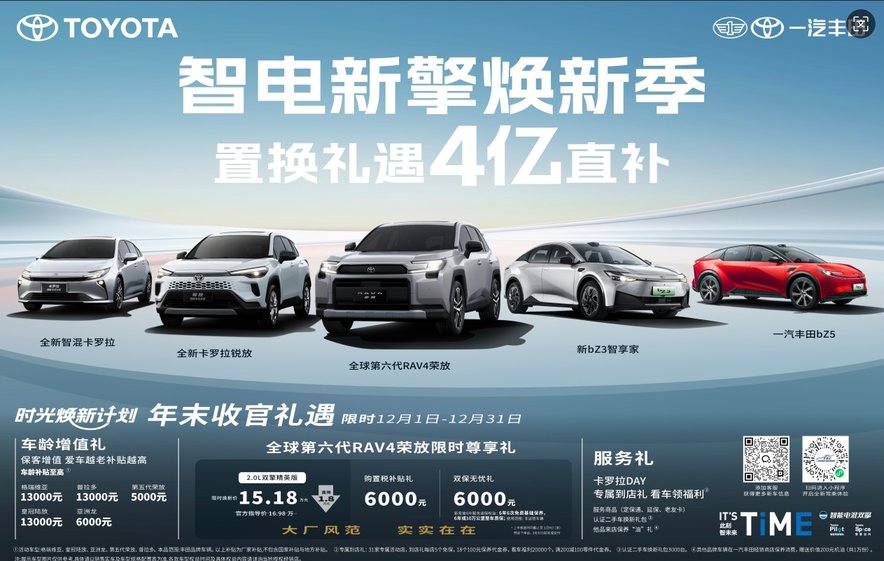 值得一提的是,12月1日-12月31日,为回馈用户厚爱,一汽丰田年末收官礼遇再升级,以4亿元厂家直补正式开启“智电新擎焕新季”。全球第六代RAV4荣放官方指导价为16.98万元的2.0L双擎精英版限时焕新价15.18万元,还可叠加享受6000元的置购税补贴礼和6000元的6年6次免费基础保养及6年或10万公里整车质保的双保无忧礼,不仅降低了用户的购车门槛,更周全地保障了后续用车生活,可谓是一次入手、长期受益。此外,皇冠陆放、格瑞维亚、普拉多等重磅车型可享至高1.3万元的车龄增值礼;更有卡罗拉DAY专属到店礼等服务礼遇,以极致诚意为用户创造最佳购车时机。