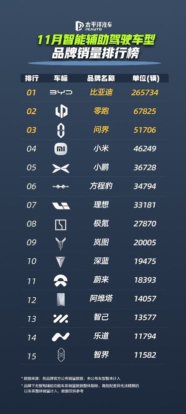 近日,比亚迪公布了其搭载天神之眼辅助驾驶系统的车型在11月的销售数据,全月销量达311267辆,继续引领市场。其中,比亚迪王朝与海洋系列贡献265734辆,方程豹、腾势、仰望等高端及个性化品牌亦表现稳健,共同构筑了比亚迪在智能驾驶领域的强大产品矩阵。