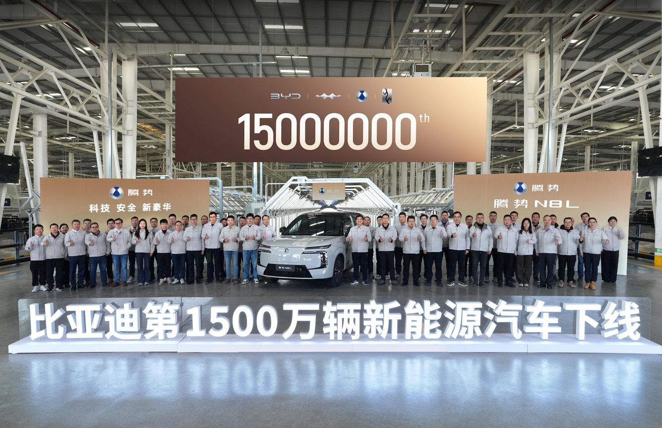 顺便一说,比亚迪刚刚成为全球首家第1500万辆新能源汽车下线的汽车品牌,而腾势N8L刚好就是第1500万辆下线车型。话说当时比亚迪第1000万辆新能源汽车下线的景象,犹在眼前,现在居然又到了第1500万辆下线的时候了,中间才隔了13个月。这种加速度实在惊人。