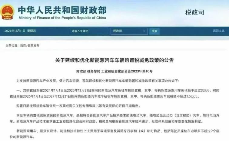2026年1月1日起,新能源汽车购置税政策将迎来重要调整:从现行的“全额免征”转为“减半征收”,且单车最高减免额不超过1.5万元。这意味着,明年购买新能源车的消费者,购车成本将明显上升。