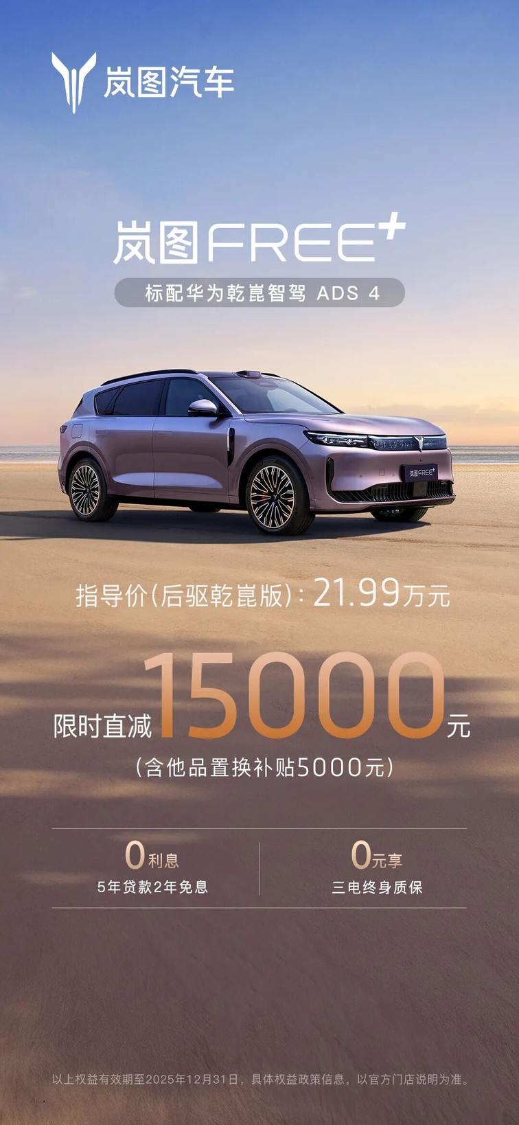首先是对冲明确的财务支出。购置税优惠退坡带来的额外支出是确定的。岚图FREE+提供的“15000元尾款减免”与“前2年0息金融方案”,构成了直接的、立即可得的财务缓冲,让消费者在政策生效前,以更优的成本锁定车辆。