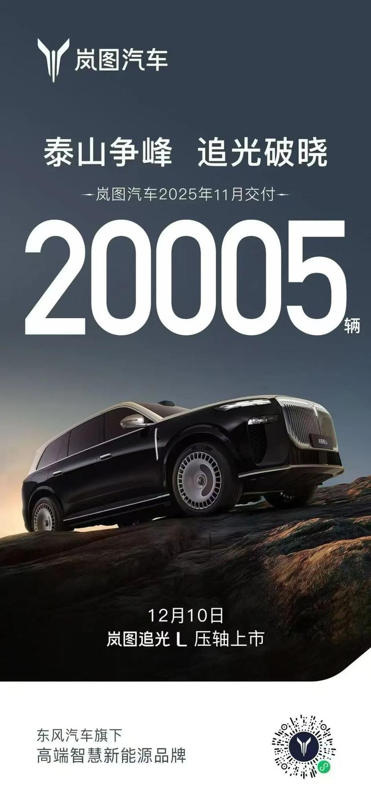 首先是交付量连续攀升,盈利结构持续优化。2025年11月,岚图汽车单月交付量首次突破2万辆,达20005辆,实现了月度销量“十连涨”。1-11月累计交付量同比增长82%。