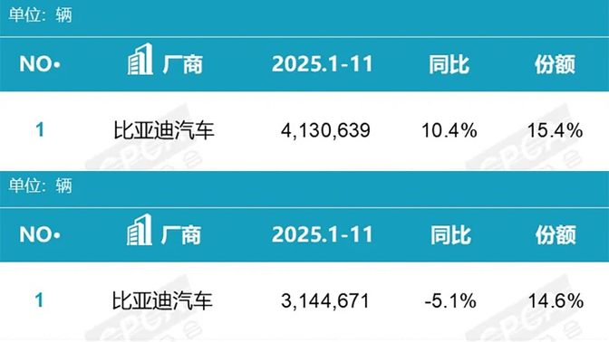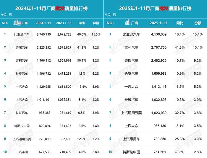 当然,变化显著的其实还是特斯拉。2025年1-11月,它交出的批发销量数字是75.45万辆,这低于2024年同期的82.28万辆。