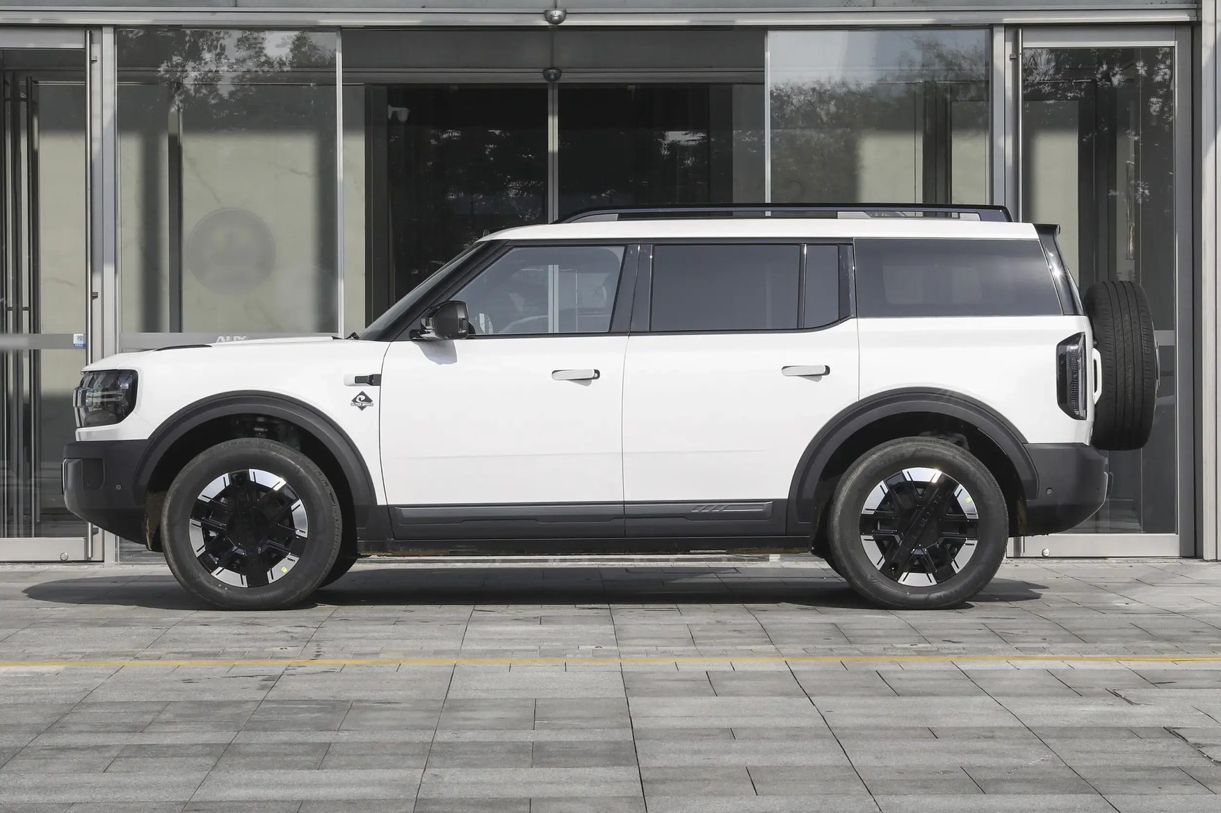 新车长宽高分别为5025/1960/1825毫米,轴距达到2950毫米,定位于新能源中型SUV。无喷漆材质轮眉不仅增强了越野气息,也降低了轻微剐蹭的维修成本;车辆尾部保留了硬派SUV的标志性设计:外挂式备胎、侧开式尾门以及竖向尾灯组。这一设计既延续了经典越野元素,也提供了实用功能。