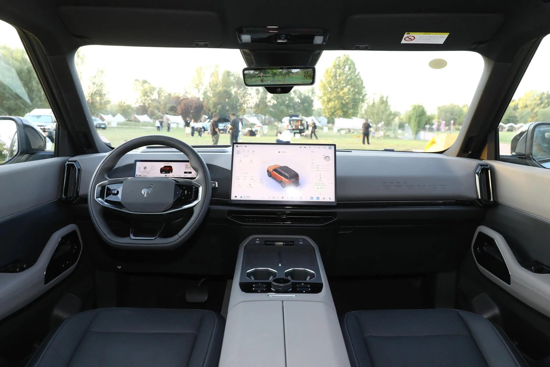 智能化方面,智趣烈马部分车型前端配备了激光雷达和双Orin x驾驶辅助芯片,支持高速NOA辅助驾驶以及泊车辅助等功能。这一配置让它在智能驾驶方面达到了主流领先水平;独特的越野360系统通过全车31个传感器实时感知车身姿态,可提前预警俯仰/侧倾角风险。系统还能在70英寸AR-HUD上显示海拔、指南针、车辆姿态等越野信息。