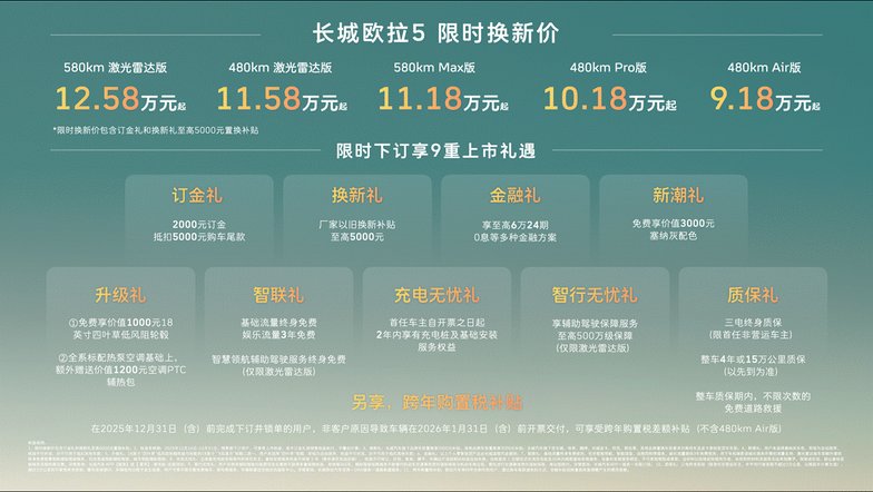 【中国·保定】2025年12月16日——今日,长城汽车欧拉品牌全新A级纯电SUV——长城欧拉5正式上市。新车共推出5款配置,建议零售价区间为 9.98万至13.38万元,限时换新价9.18万元起(限时换新价包含“订金礼”和“换新礼”至高5000元以旧换新补贴)。为回馈广大用户的热爱与支持,即日起至2025年12月31日,用户下订并锁单即可尊享包含订金礼、换新礼、智行无忧礼在内的9重上市好礼,以及跨年购置税补贴(不含480km Air版)等丰厚购车权益。凭借诚意十足的价格权益与越级产品力,长城欧拉5致力于成为全球年轻用户的“严选搭子”。